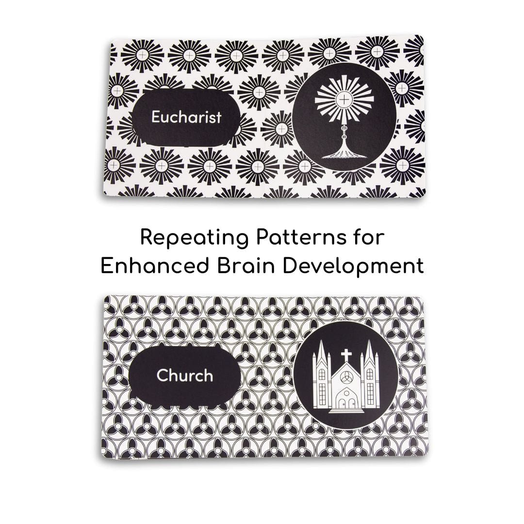 Introducing “Baby’s 1st Catholic Book: A High Contrast Book,” a specially designed board book to engage and stimulate your baby’s developing vision and brain AND introduce them to our beautiful Catholic faith.