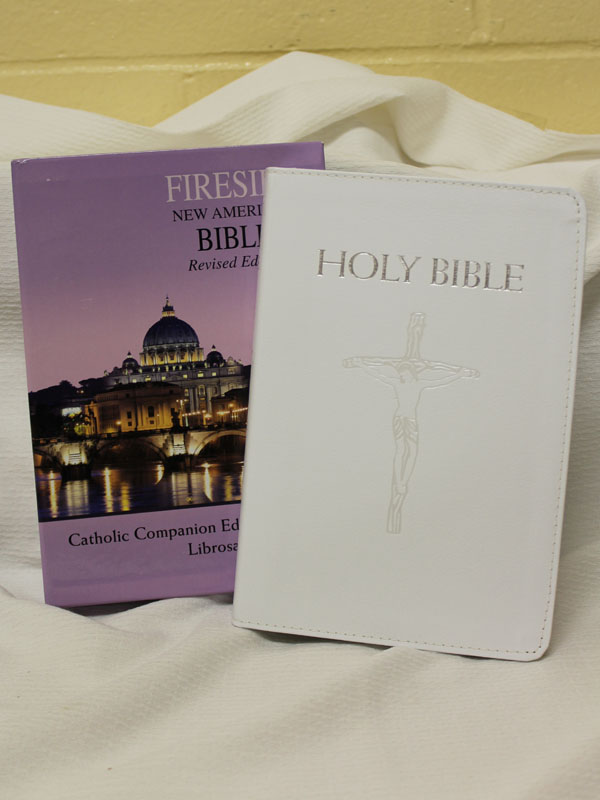 The only Bible with a pray-along Rosary embossed in the back cover, a crucifix embossed on the cover.