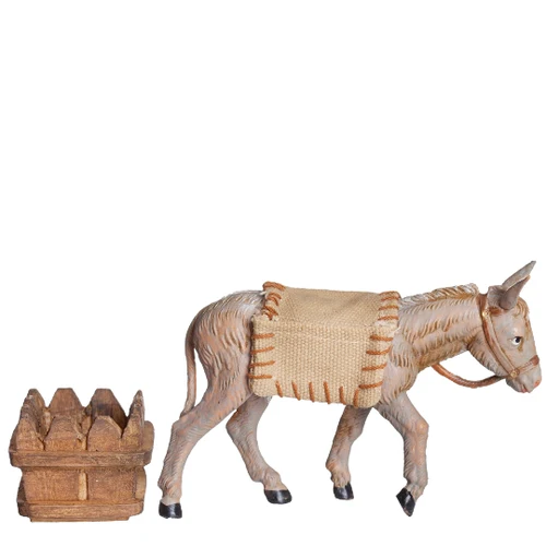 This Fontanini figure pays tribute to the faithful donkey who carried Mary on the long journey from Nazareth to Bethlehem. After days of travel, he remained at the side of the Holy Family, his saddle blanket offering comfort as he rested near the newborn Savior. Shown mid-step with a woven-textured saddle and accompanied by a separate feeding trough, this piece reflects the quiet yet vital role he played in one of the most sacred stories.