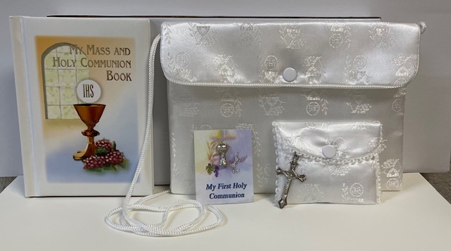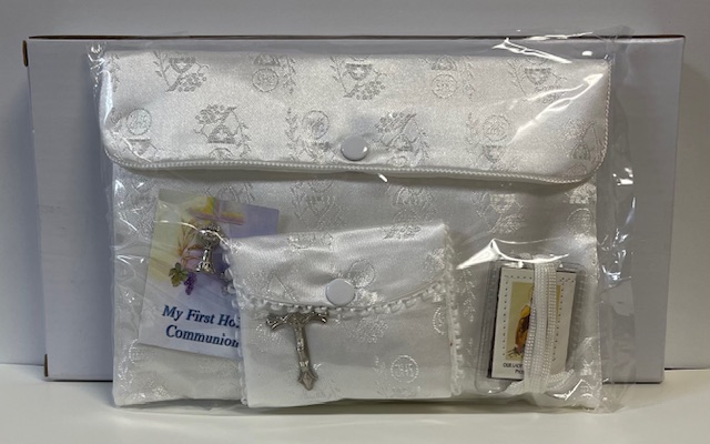 Girl’s gift set consisting of white silk like purse, First Light edition book, rosary case, rosary, scapular and pin. Devon