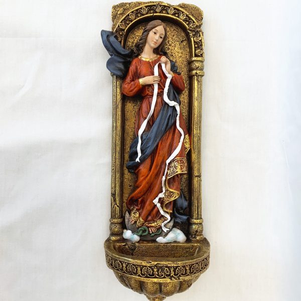 Full color holy water font of Our Lady Undoer of Knots, with an antique style back ground. #ROM 602003