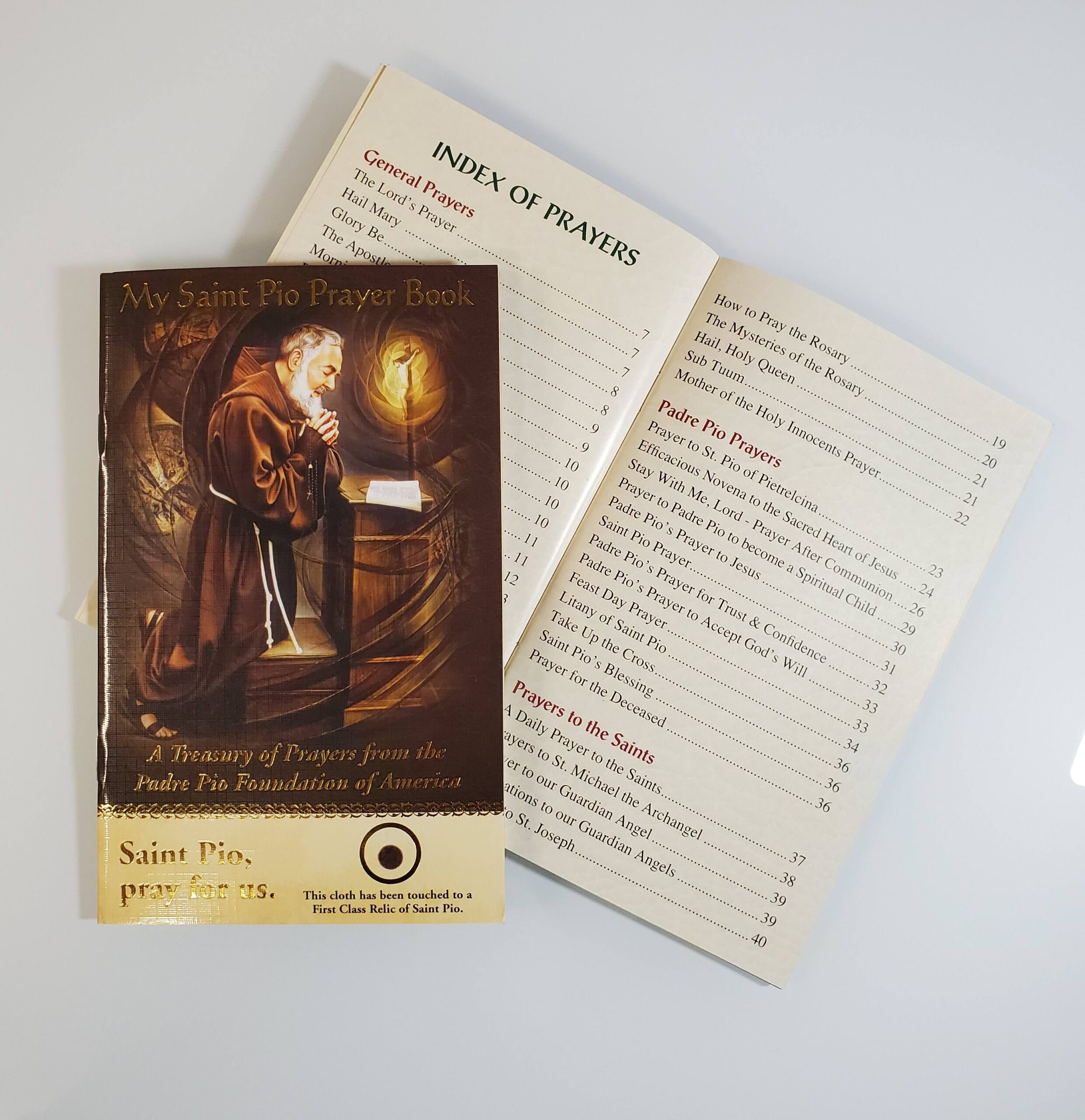 This prayer book provides a collection of prayers to and by Saint Pio, as well as all the basic Catholic prayers to Our Lord, Our Lady, and favorite saints. Includes an Index of Prayers, brief biography, and prayers for various needs. This large print prayer booklet comes with a blessed relic on the front and a prayer to Saint Pio on the back. A thoughtful and generous gift to someone who does not have a prayer book or a prayer book that complements a collection of prayer books.