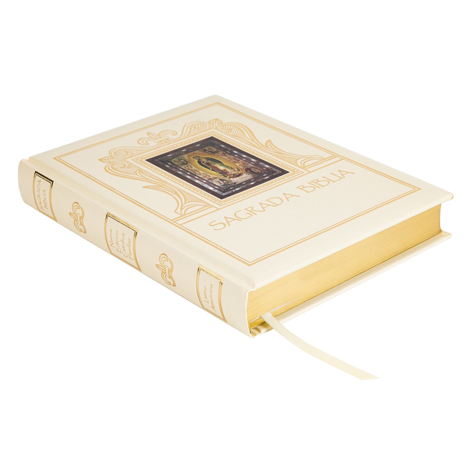 Cubierta acolchada en color crema con relieve dorado, bordes de las páginas dorados con una sección especial: Lecturas de las Escrituras para el día de nuestra boda (hace que la Biblia familiar sea un recuerdo sacramental para ser atesorado para toda la vida).