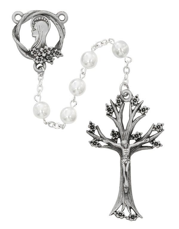 7MM White glass beads with pewter center and dogwood tree Crucifix. Gift box included. Made in the USA. #MCV R706DF